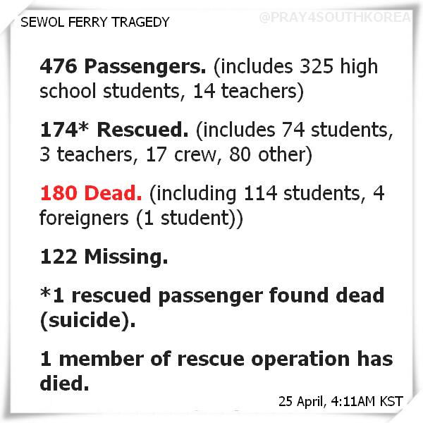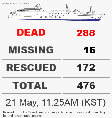 Current statistics. 29 aprile 2014. URL consultato il 30 aprile 2014 L'immagine è stata tratta da: @Pray4SouthKorea Twitter - ^ Traghetto affondato: presidente Corea Sud: "È omicidio" in ANSA (Tokyo), 24 aprile 2014. URL consultato il 28 aprile 2014.